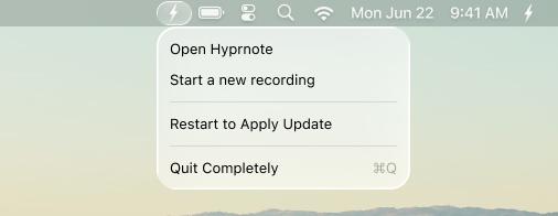 - Quit Hyprnote completely by clicking on the tray icon and the menubar icon, then click "Quit completely"